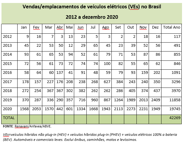 As vendas de veículos eletrificados no Brasil bateram novo recorde em 2020, com aumento de 66,5% nos emplacamentos em relação a 2019.