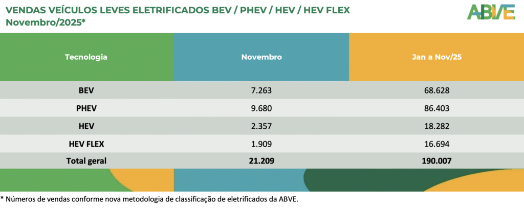 Dos 21.209 eletrificados vendidos em novembro de 2025, 79,9% (16.943) foram elétricos plug-in (BEV e PHEV), sendo que os PHEV foram responsáveis por 45,7% (9.680) e os BEV 100% elétricos por 34,2% (7.263).