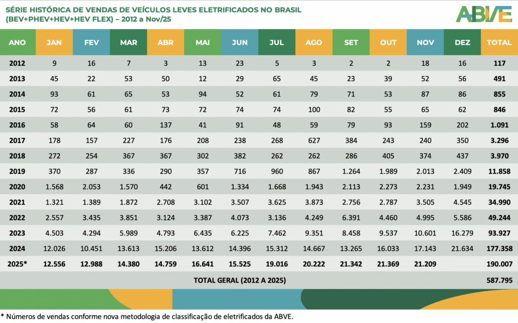 Em novembro, o mercado nacional de eletrificados leves emplacou 21.209 veículos, com uma leve retração de 0,75% em relação a outubro (21.369). Já na comparação com novembro de 2024 (17.143), há um aumento de vendas de 23,7%.