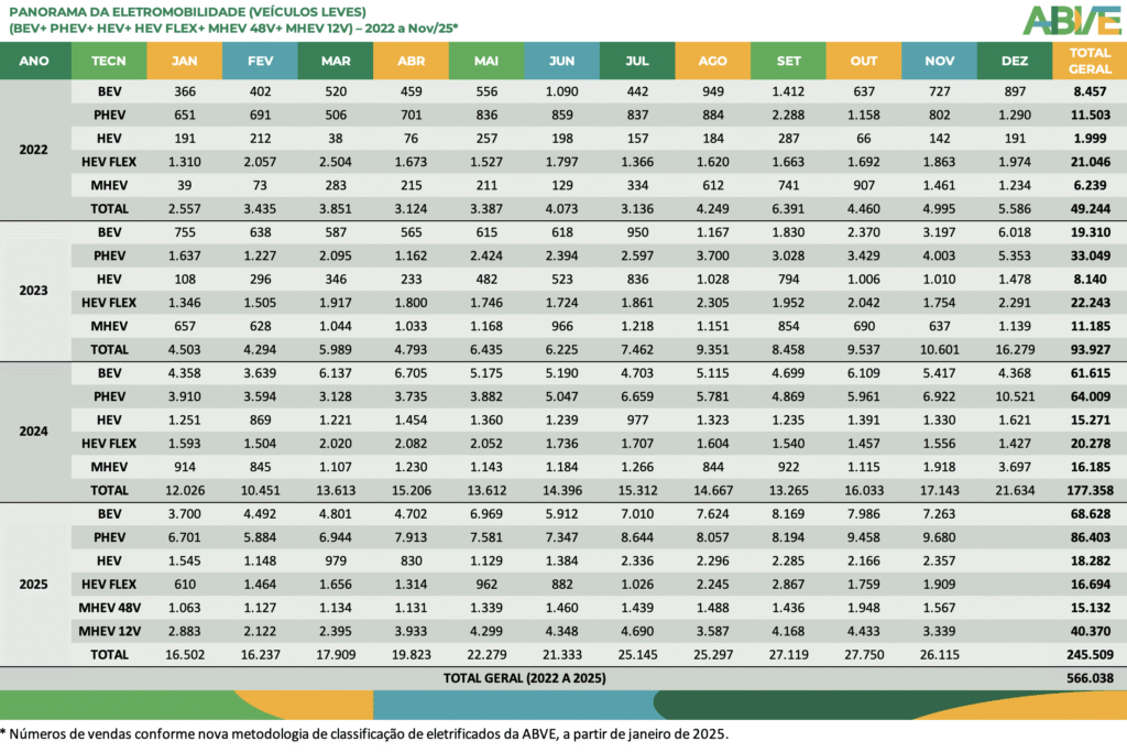 Veículos leves eletrificados por tecnologia no Brasil em novembro de 2025: