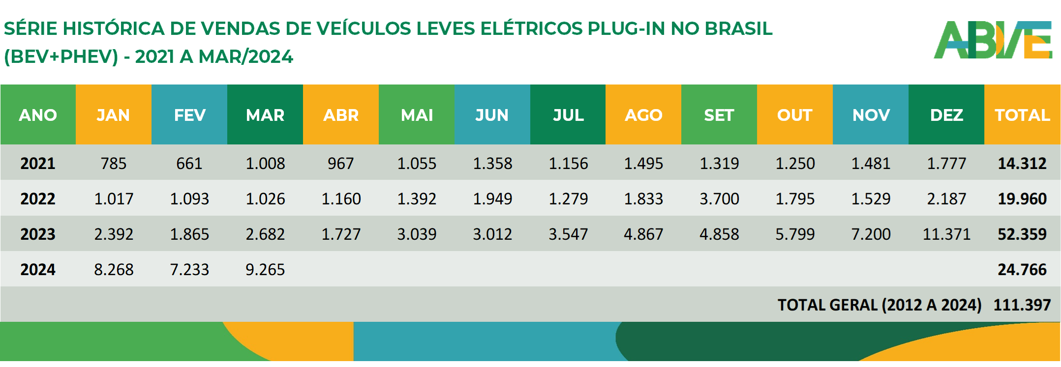 Março encerra o primeiro trimestre de 2024 com ótimos números para o mercado de veículos leves eletrificados no Brasil, posicionando-se como o segundo melhor mês da série histórica da ABVE, com 13.613 emplacamentos.