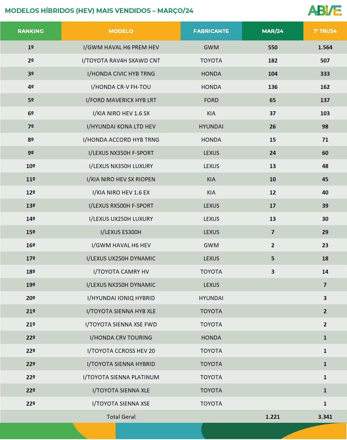 Em março, as três montadoras que lideraram os emplacamentos de veículos leves eletrificados foram BYD (6.213), Toyota (1.908) e GWM (1.705). As três foram responsáveis por 72% dos 13.613 emplacamentos de eletrificados do mês.