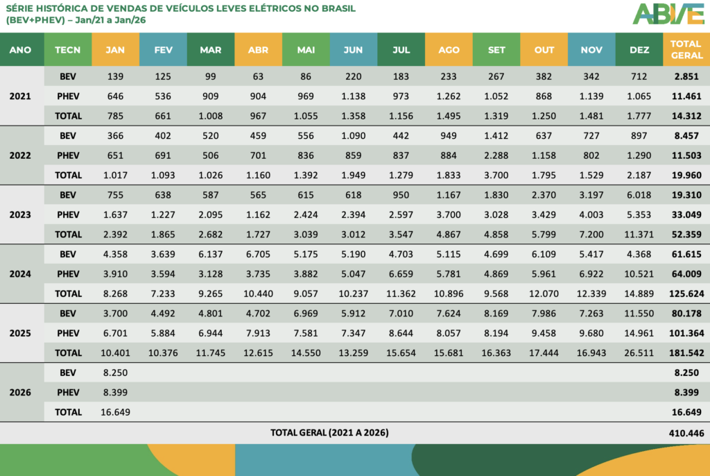 A participação de mercado dos veículos elétricos plug-in (BEV e PHEV) atingiu 10% em janeiro, com vendas de 16.649 unidades. É a primeira vez na série histórica da ABVE que os veículos com recarga externa alcançam dois dígitos de market share sobre o total das vendas domésticas de veículos leves.