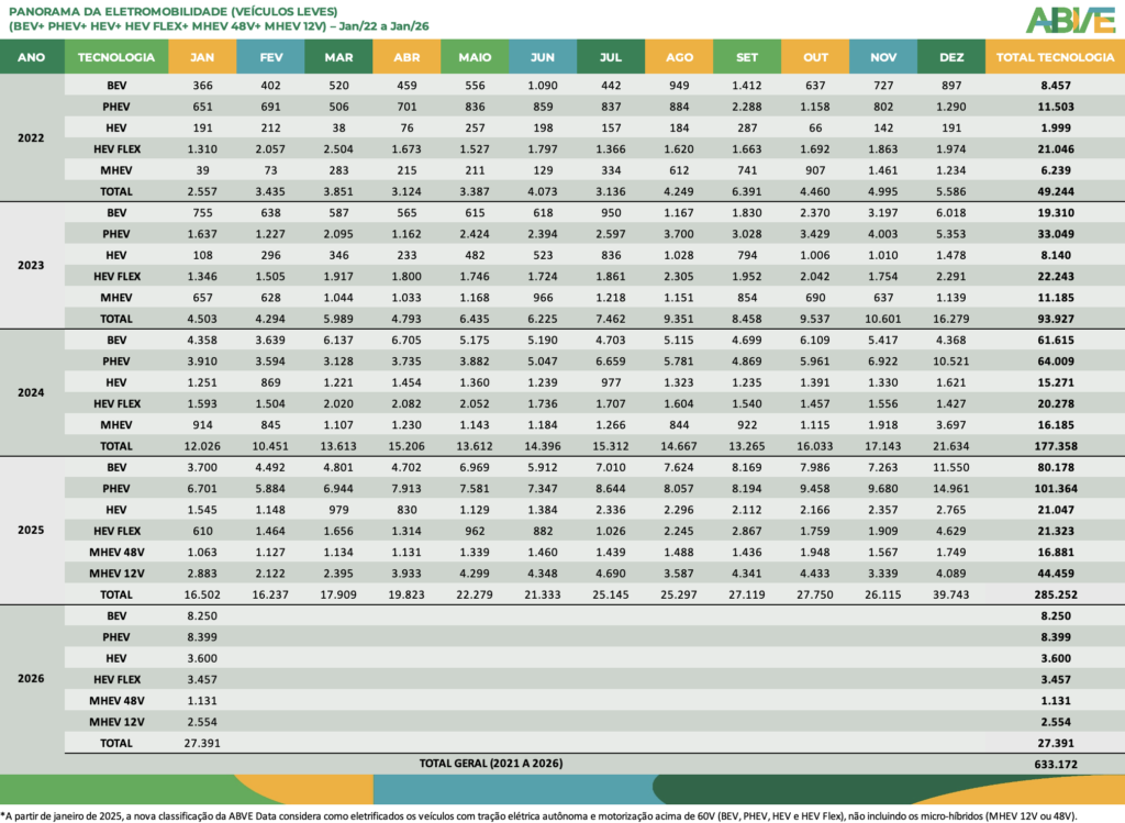 Já as vendas dos veículos micro-híbridos MHEV totalizaram em janeiro 3.685 unidades, com uma retração nas vendas de 37% sobre dezembro (5.838). Em relação a janeiro de 2025 (3.946) a retração é de 7%.